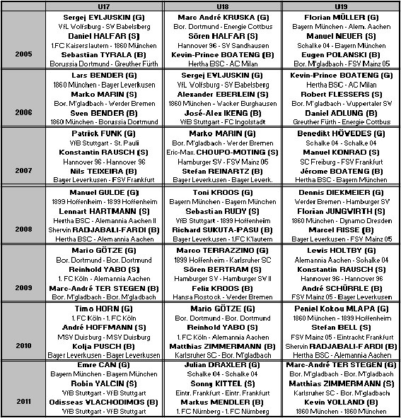 Bei den Geehrten fällt auf, dass einige Profis, die sich mittlerweile einen großen Namen gemacht haben, fehlen. Dies liegt überwiegend daran, dass sie zum Zeitpunkt der Wahl nicht, oder nur unregelmäßiger Bestandteil der jeweiligen U-Nationalmannschaft waren. Zu den „Übersehenen“ zählen Sami Khedira (Real Madrid), Gonzalo Castro (Bayer Leverkusen) und Andreas Beck (1899 Hoffenheim), die in den selben Jahrgang fallen wie Kevin-Prince Boateng. Mats Hummels (Borussia Dortmund) und Mesut Özil (Real Madrid) sucht man ebenfalls vergebens, was aus heutiger Sicht bei den eher namenlosen Geehrten (z.B. José-Alex Ikeng – heute FC Ingolstadt 04, Alexander Eberlein – heute Wacker Burghausen oder Manuel Konrad – heute FSV Frankfurt) des 1988er-Jahrgangs verwundert. Auch die Nationalspieler Holger Badstuber, Thomas Müller (beide Bayern München), Marco Reus (Borussia M’gladbach) oder Ron-Robert Zieler (Hannover 96) fehlen. Allerdings hatten sie es mit dem starken U19-Europameisterjahrgang um Marcel Risse (FSV Mainz 05), Stefan Reinartz, Sven und Lars Bender zu tun. Mit Alexander Merkel (CFC Genua) und Bernd Leno (Bayer Leverkusen) fehlen aktuell herausragende Junioren, die zuletzt in der Serie A bzw. der Bundesliga für Furore sorgten. Mit Mario Götze und Marc-André Ter Stegen (Borussia M’gladbach) aus dem U17-Europameisterteam hatten sie allerdings ebenfalls äußerst starke Konkurrenz.