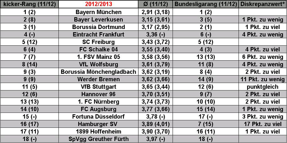 Das Gros der Liga landet jedoch verdientermaßen auf den erreichten Plätzen. Einzig Schalke und die Eintracht hätten die Plätze mit weitreichenden Folgen tauschen müssen. Die Frankfurter würden an der Qualifikation zur Champions League teilnehmen, die Schalker in der weniger lukrativen Europa League. Bei den Bayern, Freiburg und Greuther Fürth stimmten die Positionen in beiden Ranglisten exakt überein. Bayern überflügelte mit einem Notenschnitt von 2,91 nochmals die schon überaus starken Resultate des BVB aus den vergangenen beiden Jahren (2,96 und 2,95). Fürth steht mit seinen 3,97 zwar am Ende der Tabelle, aber im Saisonvergleich gar nicht so schlecht da. Im vergangenen Jahr hätte der Schnitt für den kicker sogar zum Klassenerhalt gereicht, da bei drei Teams (Köln, HSV, Lautern) eine 4 vor dem Komma stand.