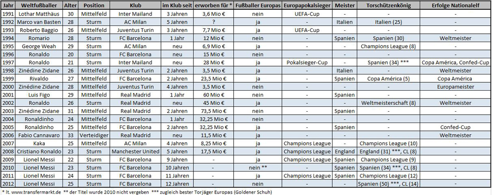 Zwölf der 22 Weltfußballer errangen im Jahr der Ehrung einen Torjägertitel. Entweder in der nationalen Liga, in der Champions League, bei der Copa América oder bei der Weltmeisterschaft. Tore sind folglich bei der Vergabe das Salz in der Suppe. Mit Fabio Cannavaro reiht sich lediglich ein Verteidiger in die Riege der bisherigen Weltfußballer ein, allerdings hatte er 2006 die Squadra Azzurra als Kapitän zum Weltmeistertitel geführt. Alle anderen Preisträger überzeugten als treffsichere Goalgetter oder als Spielgestalter und Vorlagengeber. Insofern ist die diesjährige Wahl zwischen Ribéry, Messi und Ronaldo ein Spiegelbild dieser Tatsache. Messi und Ronaldo die Tormaschinen, Ribéry der Wegbereiter.
