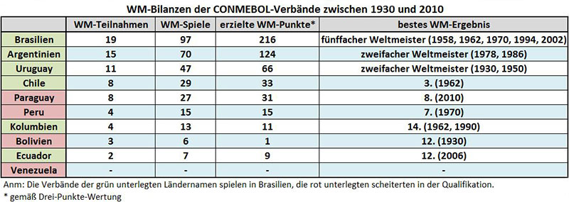 Neben den im Vorfeld erwarteten Argentinien, Uruguay und Chile fahren also Ecuador zum dritten und Kolumbien zum fünften Mal nach Brasilien. Uruguay tat sich in der Qualifikation fast schon traditionell schwer. Zum vierten Mal in Folge mussten sie in die interkontinentalen Play-offs, zum dritten Mal gingen sie als Sieger hervor. Allen sechs Südamerikanern wird zugetraut, den kontinentalen „Heimvorteil“ für sich zu nutzen und entsprechend weit zu kommen. Immerhin errangen Argentinien, Uruguay und Chile ihre größten Erfolge allesamt auf (süd)amerikanischem Boden. Entsprechend freut sich Ecuador auf seine erste WM auf dem heimischen Kontinent.