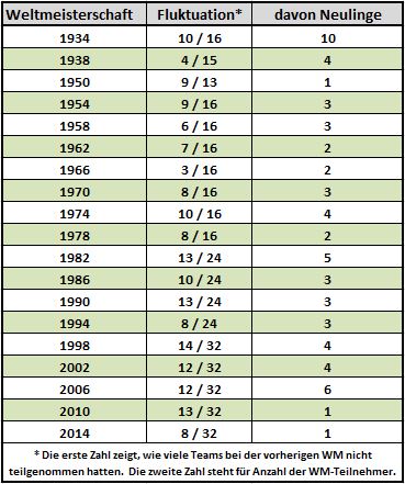 Für die letzte und die aktuelle Weltmeisterschaft qualifizierte sich nur je ein Neuling. Zunächst die Slowakei, dann Bosnien-Herzegowina (s. gesonderten Beitrag: Link). Das bedeutet in beiden Fällen die Einstellung des Minusrekordes von 1950. Beim diesjährigen Turnier hat die FIFA zudem eine überschaubare Fluktuation unter den Teilnehmern zu verzeichnen. 24 Mannschaften der laufenden Fußball-WM waren bereits 2010 am Start. Das heißt, dass sich lediglich 25 Prozent aller Teilnehmer von der Zuschauerrolle in den erlauchten Kreis der WM-Teilnehmer spielen konnten. Das ist mit Abstand die geringste Fluktuation seit der WM 1966 in England. Besonders statisch ist die Situation momentan in Afrika, Asien sowie Nord- und Mittelamerika.