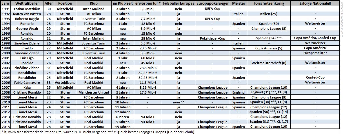Seit 2008 macht die Fußballwelt nur zwei Topfußballer auf diesem Planeten aus. Entweder gewinnt Messi oder eben Ronaldo die Wahl der Sportjournalisten, Nationaltrainer und Nationalmannschaftskapitäne. Die beiden Ausnahmespieler ballern sich mit aberwitzigen Torquoten regelrecht in den Fußballolymp. Dass in diesem Jahr wieder der Kapitän der argentinischen Nationalmannschaft dran war, galt als ausgemachte Sache. In erster Linie, weil er mit dem FC Barcelona die Champions League gewann und weil er sich in dem bedeutendsten Klubfußballwettbewerb als treffsicherster Spieler präsentierte. Gleichwohl im Verbund mit CR7 und dem dritten Nominierten im Bunde, Neymar. Damit setzt sich eine Tradition fort, die 2007 mit Kaka begann. Seit neun Jahren gewinnt immer der Spieler den Titel des Weltfußballer des Jahres, der zugleich Torschützenkönig in der Champions League wurde. Titel mit der Nationalelf treten demgegenüber in den Hintergrund. Wer Woche für Woche auf Vereinsebene überzeugt und dann auch noch der Champions League mit seinen Toren den Stempel aufdrückt, der bleibt offensichtlich mehr im Fokus als ein Welt- und Europameister Xavi, oder ein Weltmeister aus der DFB-Elf. Zudem handelt es sich bei den beiden Protagonisten um veritable Weltmarken der Werbeindustrie.