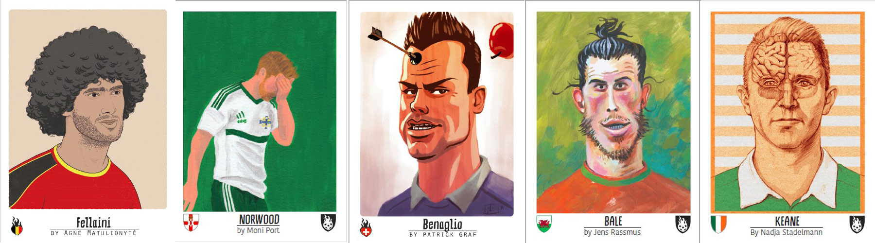 Wir haben eine Jury gewinnen können, die aus zehn Mitgliedern bestand. Zu ihnen zählten Nadya Tolokonnikova von den Pussy Riots, der ehemalige US-Nationalspieler Alexi Lalas, unsere Schweizer Nationalspielerin Ramona Bachmann und der russische Illustrator Victor Melamed, der schon für den „Rolling Stone“ und den „New Yorker“ gearbeitet hat. Jeder unserer Juroren bestimmt seinen persönlichen Sieger, der damit sicher im Album dabei ist. Daneben erstellt jeder eine Shortlist aus fünf weiteren Arbeiten, die ihm gefallen haben. Aus diesen 50 wählen wir dann intern eine stilistisch möglichst breite Auswahl der restlichen 22 KünstlerInnen. Vier der 32 Künstler kommen in diesem Jahr übrigens aus Deutschland.